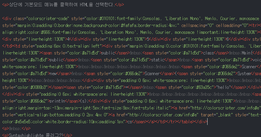 이 밖에 Syntaxhighlighte 플러그인을 사용하는 방법도 있는데 이것은 뭐 html css에 뭐 파일 추가하고 태그 사이에 뭐 작성하고 뭐 그런 귀찮은 짓거릴 해야 돼서 갖다가 버렸다. 혹시 이 방법을 원하시는 분이 있다면 다른 블로그를 참고하시길 그럼 여기까지!