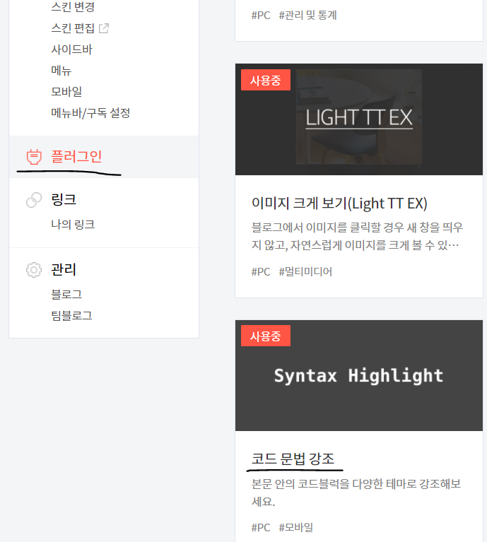 플러그인을 선택하고~ 스크롤 내려서 코드 문법 강조를 찾아서 클릭해준다.