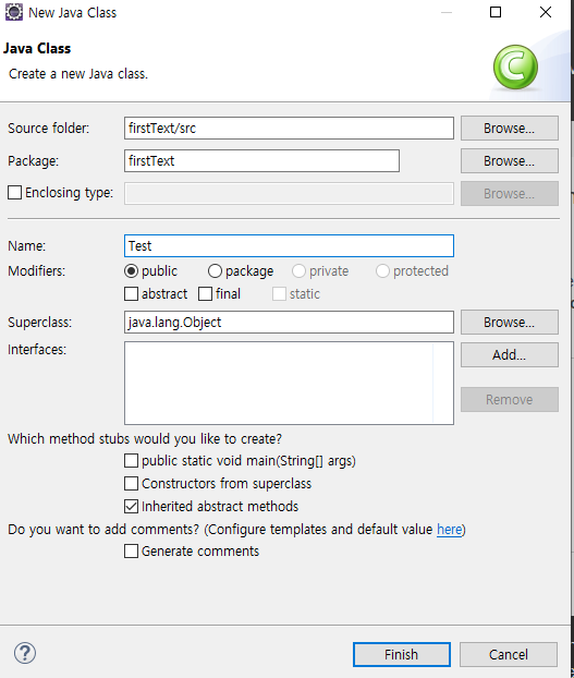 클래스 Name을 알아서 작성해주고 Finish를 누른다.