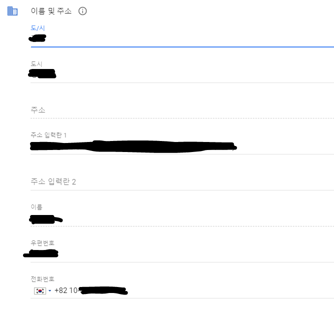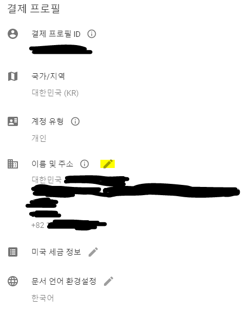 여기 결제 프로필에서 이름 및 주소 옆에 연필 모양을 클릭하면 변경, 입력할 수 있다.