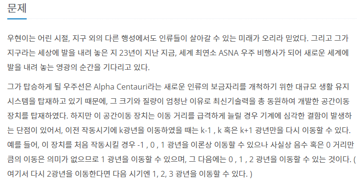 처음에 이동할 수 있는 거리는 1(k)이며 그 다음 부터는 0, 1, 2 (k-1, k, k+1) 이동 가능하다.