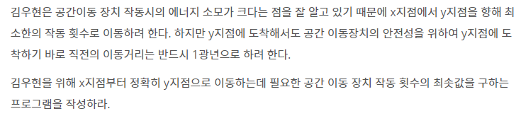 우선 입력값에 x(출발), y(도착)값을 입력한다. x -> y로 가는데 공간이동 장치를 최소 몇번 작동하는지 구하는 프로그램을 작성해야 한다.
