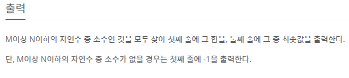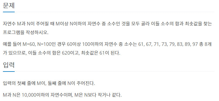 간단하다. m, n 두 수를 입력 후 m과 n 사이의 소수의 합을 출력하고 가장 작은 소수를 출력하면 된다.