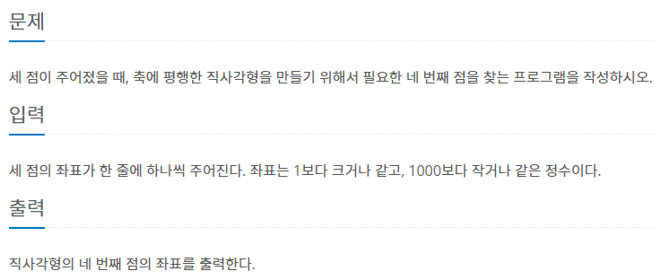 좌표를 세 개 입력하고 축에 평행한 직사각형을 만들기 위한 네 번째 점을 찾는 문제이다.
