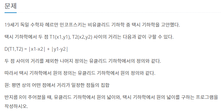 원의 넓이를 유클리드 기하학과 택시 기하학 두 가지 구하라는 문제다.