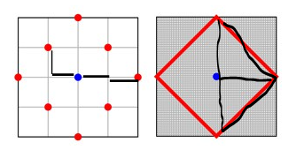 검은선이 반지름이고 그것을 계속 찍다 보면 오른쪽그림처럼 마름모꼴 정사각형이 된다.
