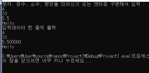 9 printf("문자, 정수, 소수, 문장을 띄어쓰기 또는 엔터로 구분해서 입력 : \n");