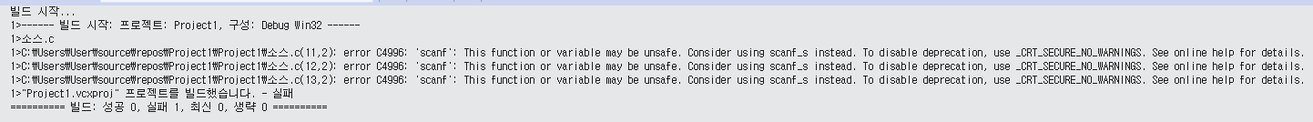 이렇게 뜬다. scanf_s를 쓰던지 _CRT_SECURE_NO_WARNINGS 를 사용해서 비활성화하라고 한다.