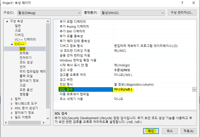 마찬가지로 Project 우클릭 => 속성 => C/C++ => 일반 => SDL 검사 => 아니요(/sdl-) => 확인