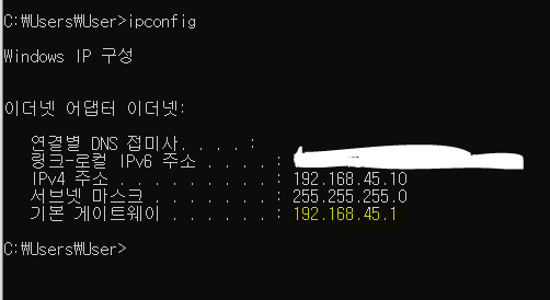 내가 사용하고 있는 공유기 url을 확인을 해보면 cmd에서 ipconfig를 입력해보면 된다.