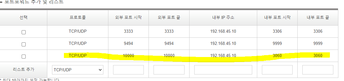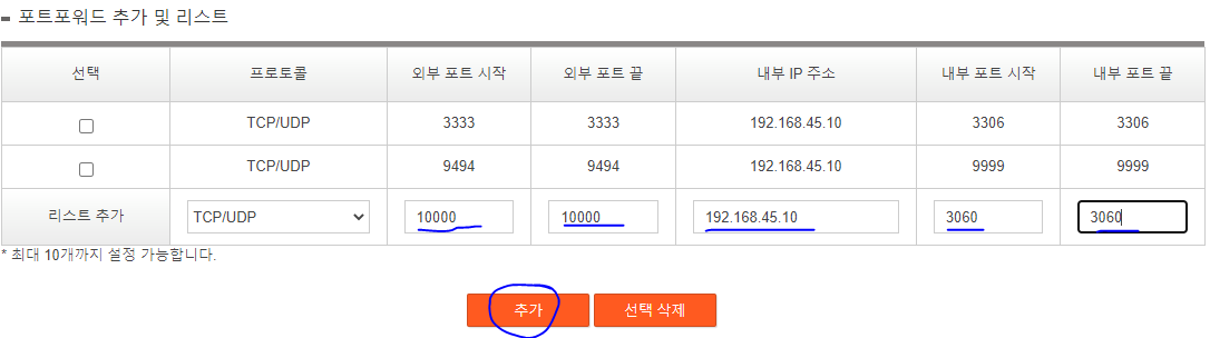 1. 외부에서 쓸 포트를 입력하고 내부 IP 주소를 입력한다. =>