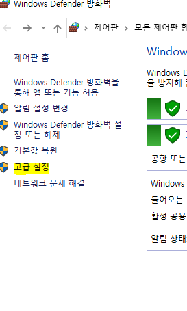 시작 => windows defender 방화벽 입력
