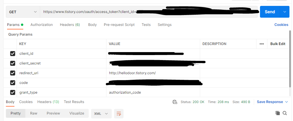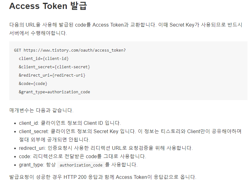 https://www.tistory.com/oauth/access_token?client_id={client-id}&client_secret={client-secret}&redirect_uri={redirect-uri}&code={code}&grant_type=authorization_code