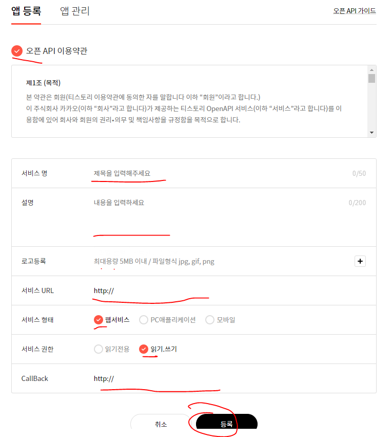 서비스 URL, CallBack URL은 본인 티스토리 블로그 url을 입력한다.