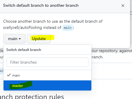 나는 master로 바꿀거니까 master를 클릭하고 Update 버튼을 클릭한다.