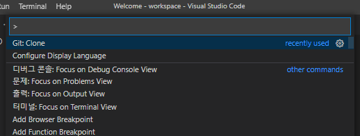 ctrl + shift + p 또는 F1 버튼을 누르고 git clone을 검색하고 클릭한다.