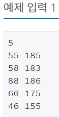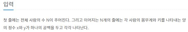 첫 줄에 몇명을 비교할 건지 n을 입력하고 두번째 줄부터 몸무게와 키를 입력한다.