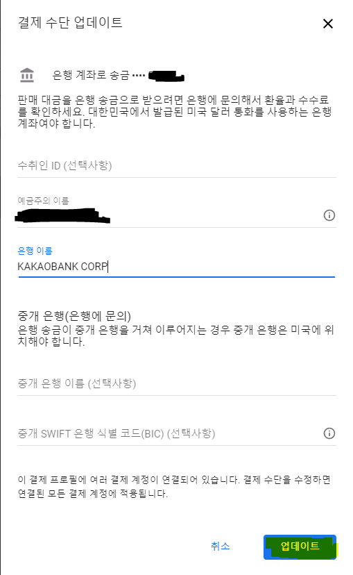 새 은행 송금 세부정보 추가를 클릭하고 아래 있는 내용을 채워준다.