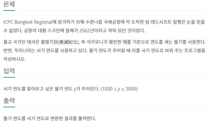 현재 우리가 세는 익숙한 연도를 서기 연도라고 하는데 불기 연도를 입력받으면 서기 연도를 출력한다.