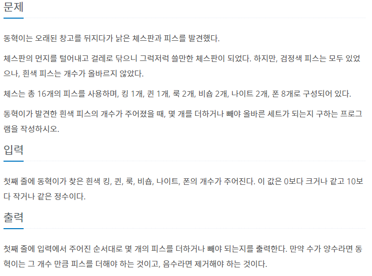 체스는 순서대로 1 1 2 2 2 8 총 여섯개의 수가 있다.