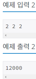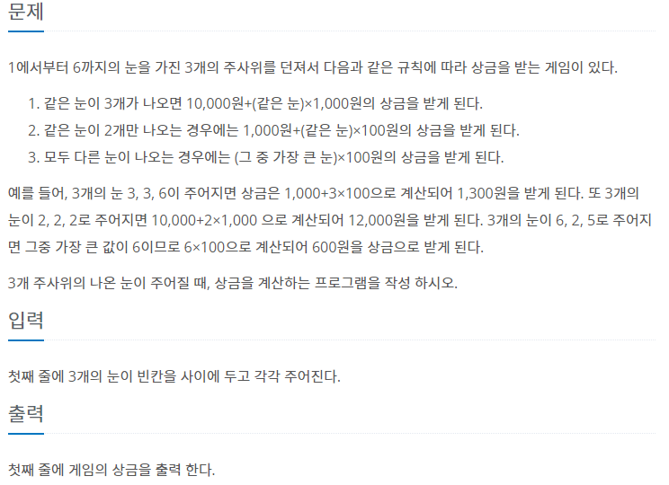 1. 입력값 세개가 같으면 10000 + 같은 값 * 1000