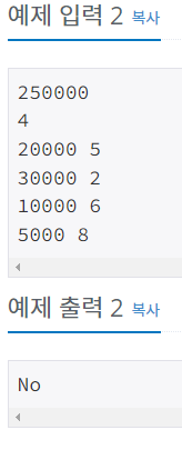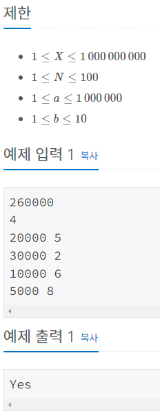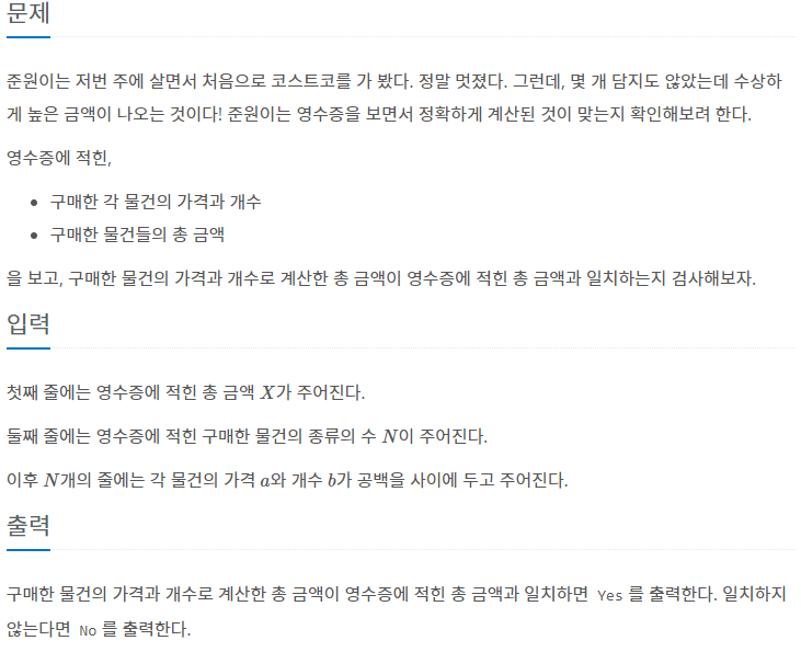 총 금액을 입력받고 각각 구매한 물건의 가격과 개수를 입력받는다. 금액이 일치하면 yes 아니면 no를 출력