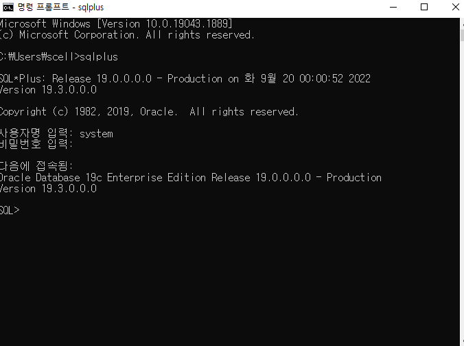 > sqlplus 입력하고 사용자명, 비밀번호 입력해서 확인