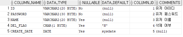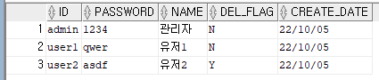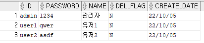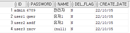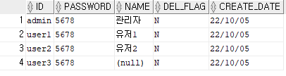이렇게 id, password만 들어가게 된다. 참고로 del_flag와 create_date는 default 값이 있어서 자동으로 데이터가 들어간다.