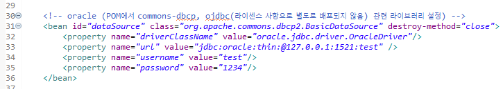 테스트 실행용은 말 그대로 내장용디비로 테스트용이다. 저걸 주석처리하고 아래 보면 oracle이 있는데 주석 해제 한다.