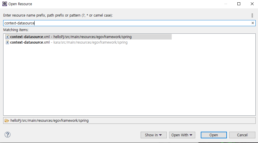 우선 resources -> egovframework -> spring -> context-datasource.xml 을 열어보자.
