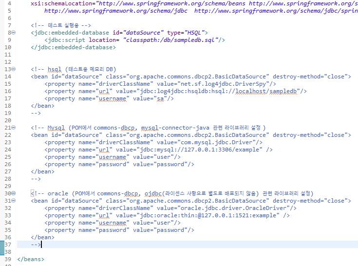 뭔가 친절하게 mysql, oracle db 사용시 아래 설정 추가로 나와 있다. 우선 저걸 다 주석해제 한다.