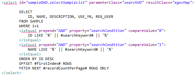 우선 insert, update, delete 뭐 다 확인해봐야겠지만.. 우선 화면만 띄우는게 목적이라 (지침) selectSampleList 쿼리만 확인한다.