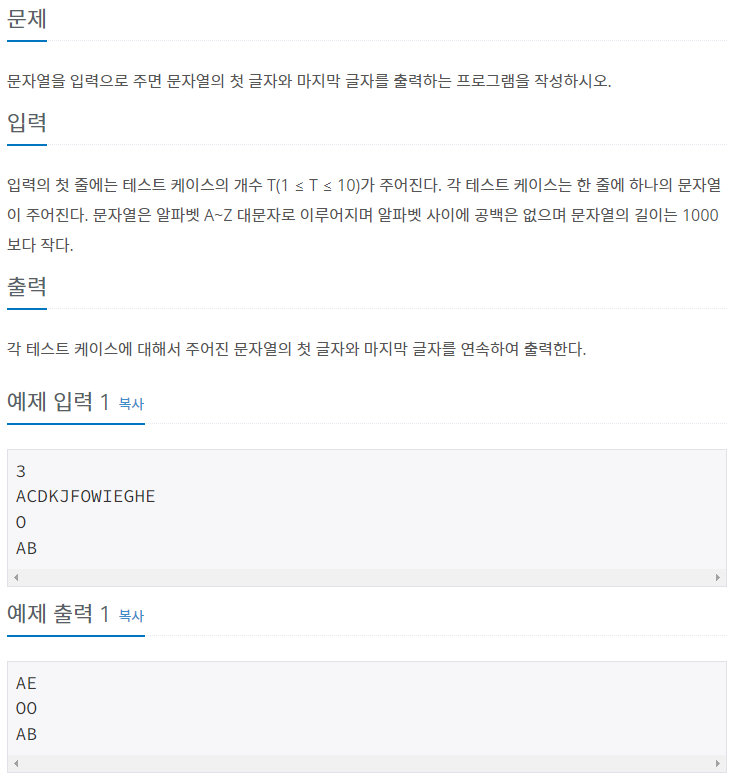 문자열의 처음과 끝을 출력해 주면 되는데 charAt() 함수를 사용하여 출력한다.