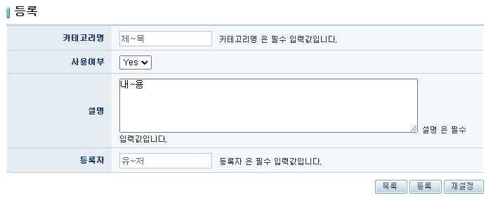 저 카테고리명, 설명, 등록자에 내용을 적고 등록을 누르면 fn_egov_save() 함수를 호출하는데