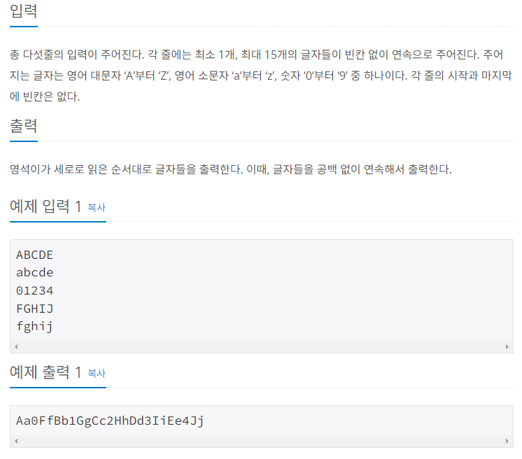 한 행에 0 ~ 15까지 입력할 수 있으니 char[5][15]로 선언을 하고 한 줄 씩 입력받으니 우선 String으로 입력받고 String 값 길이만큼 charAt() 함수로 2차원 배열에 입력한다.