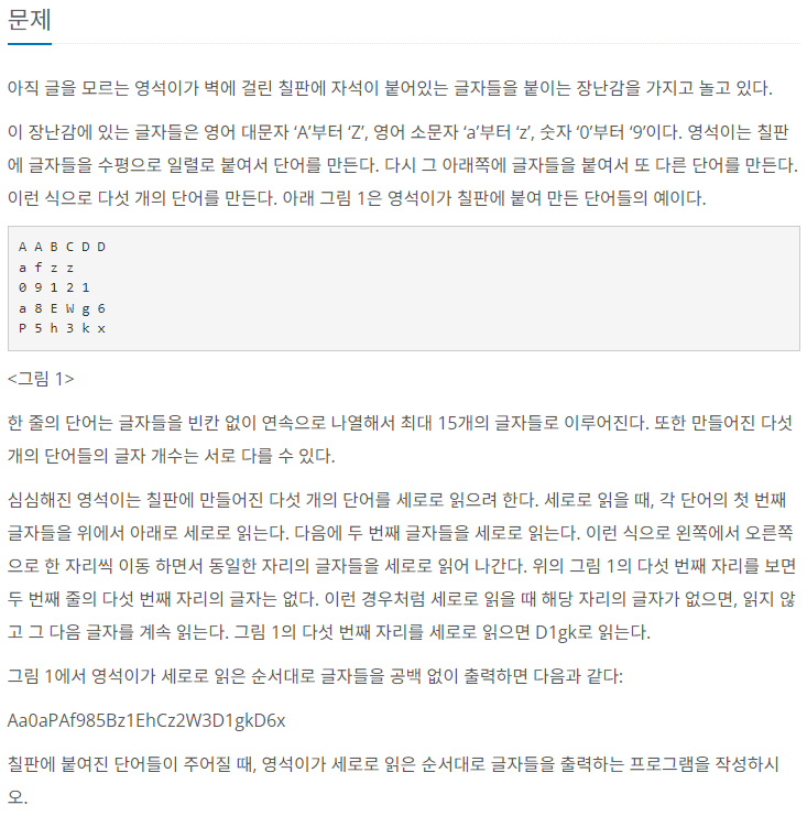 5줄 입력받고 배열의 값이 null 이 아니면 행부터 증가하면서 출력. char변수는 null 체크를 0으로 한다.