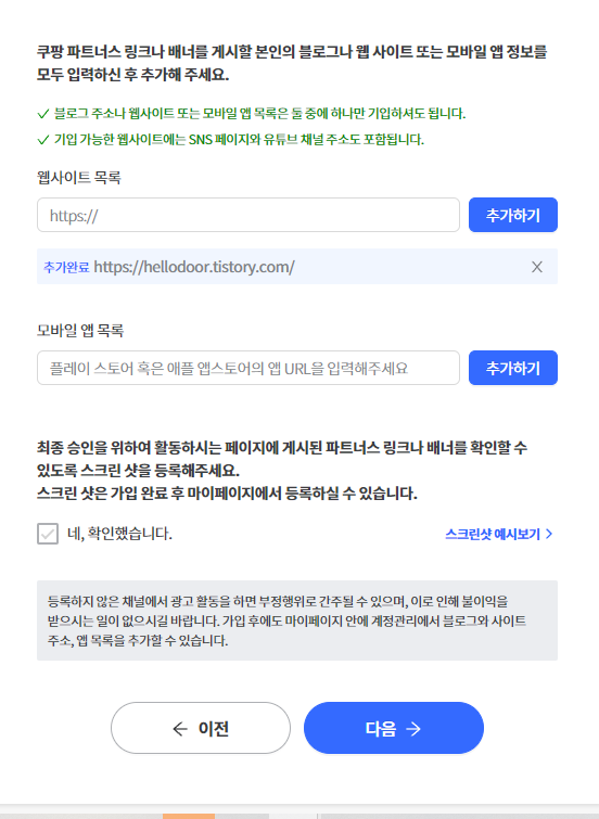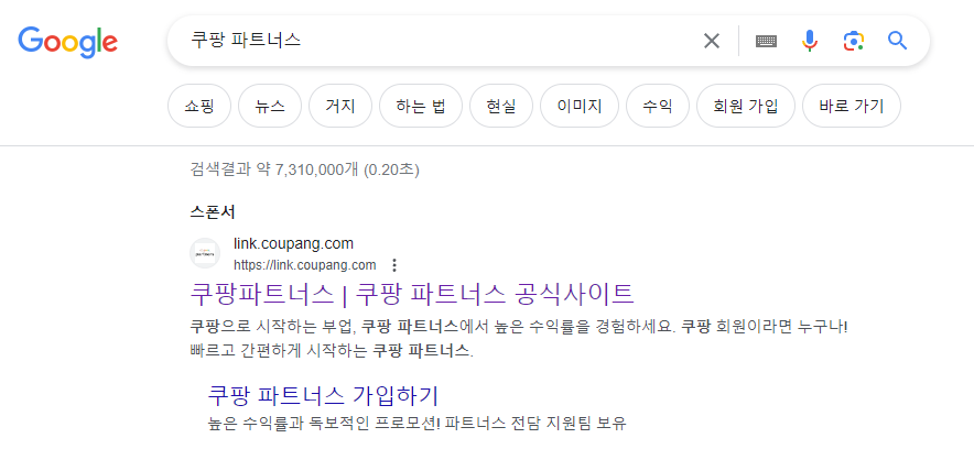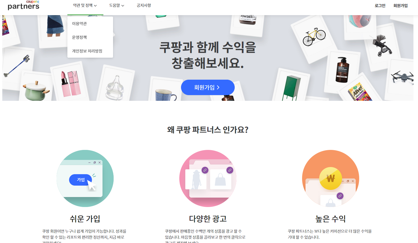 블로그에서 수익이 너무 안난다. 사실 조회수도 높지 않아서 별 기대를 안하고 있긴 한데 그래도 아쉬운 마당에 숟가락 하나 더 늘려서 한 삽 퍼볼려고 요즘 여기저기 많이 보이는 쿠팡 파트너스를 해보려고 한다.