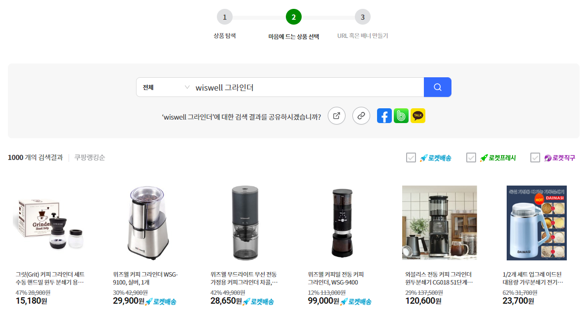 내가 글 쓸 상품을 검색하고 상품위에 마우스를 가져가면 링크생성이 있다. 내가 사서 사용중인 그라인더를 검색했다.