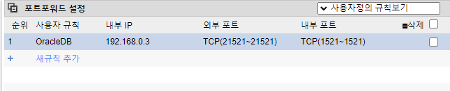 - 포워딩할 내부 포트를 입력한다. 현재 내 pc에 오라클 db 포트를 1521로 설정해서 내부 포트에 1521을 입력한다.