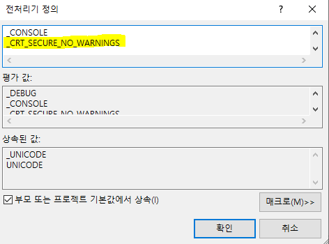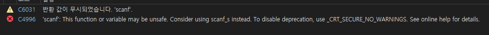 scanf 함수가 비주얼 스튜디오에서 보안 이슈로 막혀있어서 그렇다고 한다.