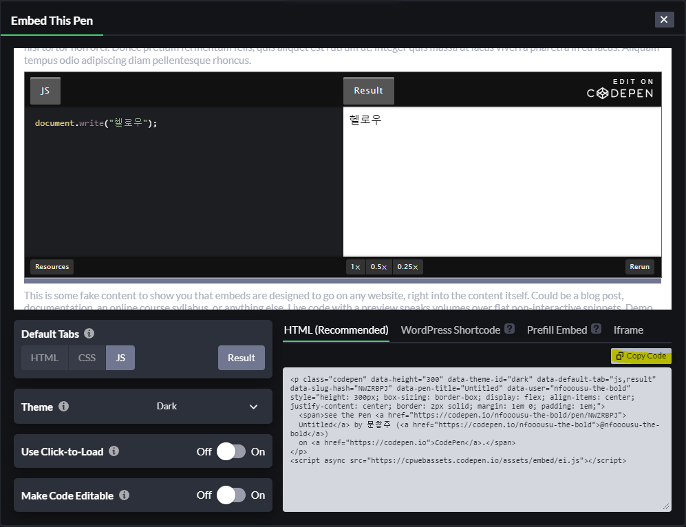 테마를 고르고 Copy Code를 누른다.