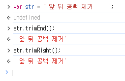 마찬가지로 뒤에 공백은 trimEnd(), trimRight()를 사용해서 제거하면 된다.