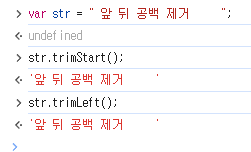 문자열에서 앞부분 공백만 제거하려면 trimStart(), trimLeft() 둘 중 하나 함수를 사용하면 된다.
