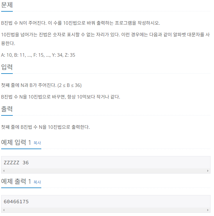두 수 N과 B를 입력받고 B진법 수 N을 10진법으로 변환해서 출력해 주는 프로그램을 작성한다.