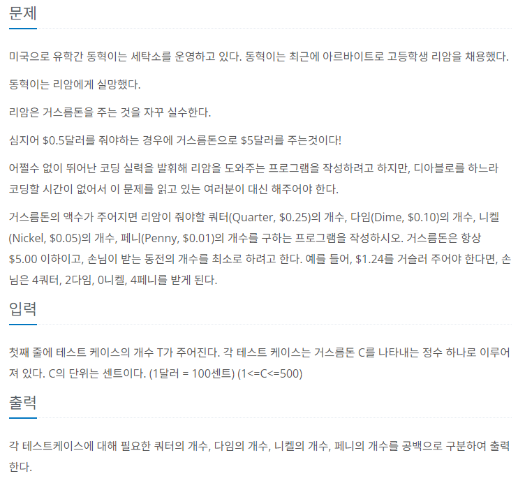 거스름돈 동전의 단위는 25센트(쿼터), 10센트(다임), 5센트(니켈), 1센트(페니) 이 순서대로 공백을 넣어 각 동전의 개수를 출력하면 된다.