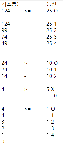 거스름돈을 가장 큰 동전부터 뺄 수 있을만큼 다 빼고 그 다음 큰 동전으로 가고 가고 분배해주면 끝나는 문제다.