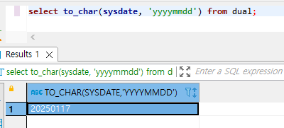 to_char(컬럼, 'yyyymmdd') 이런식으로 작성하면 20250117 이렇게 출력된다.
