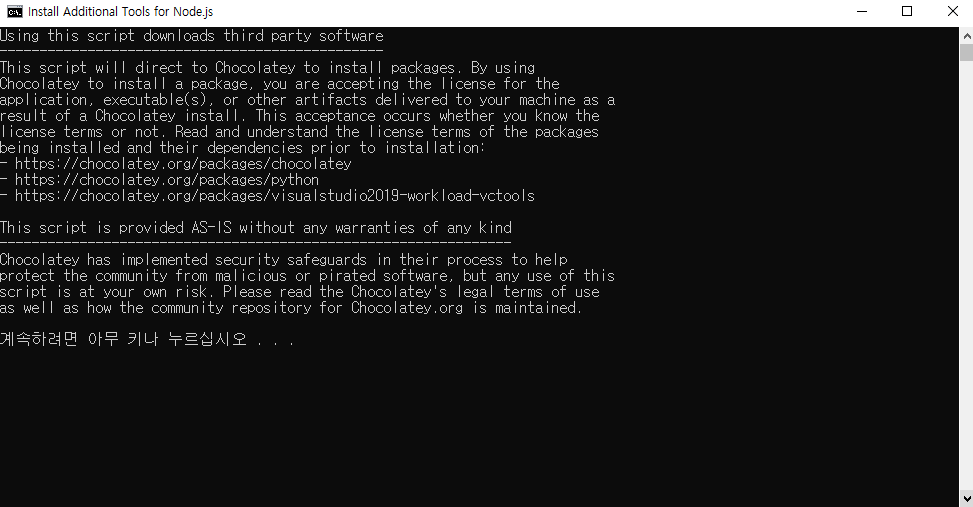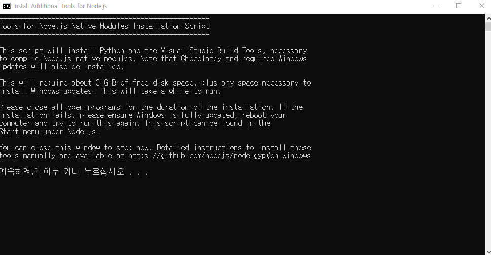 Node.js 기본적인 모듈 설치 스크립트 같다. 아무 키나 누른다.