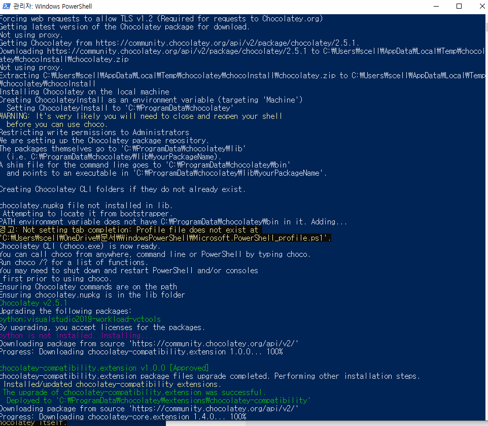 아까 체크했던 Chocolatey package를 설치하는 것 같다.