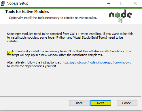체크 후 Next.필요한 툴을 자동적으로 설치해 준다고 한다.